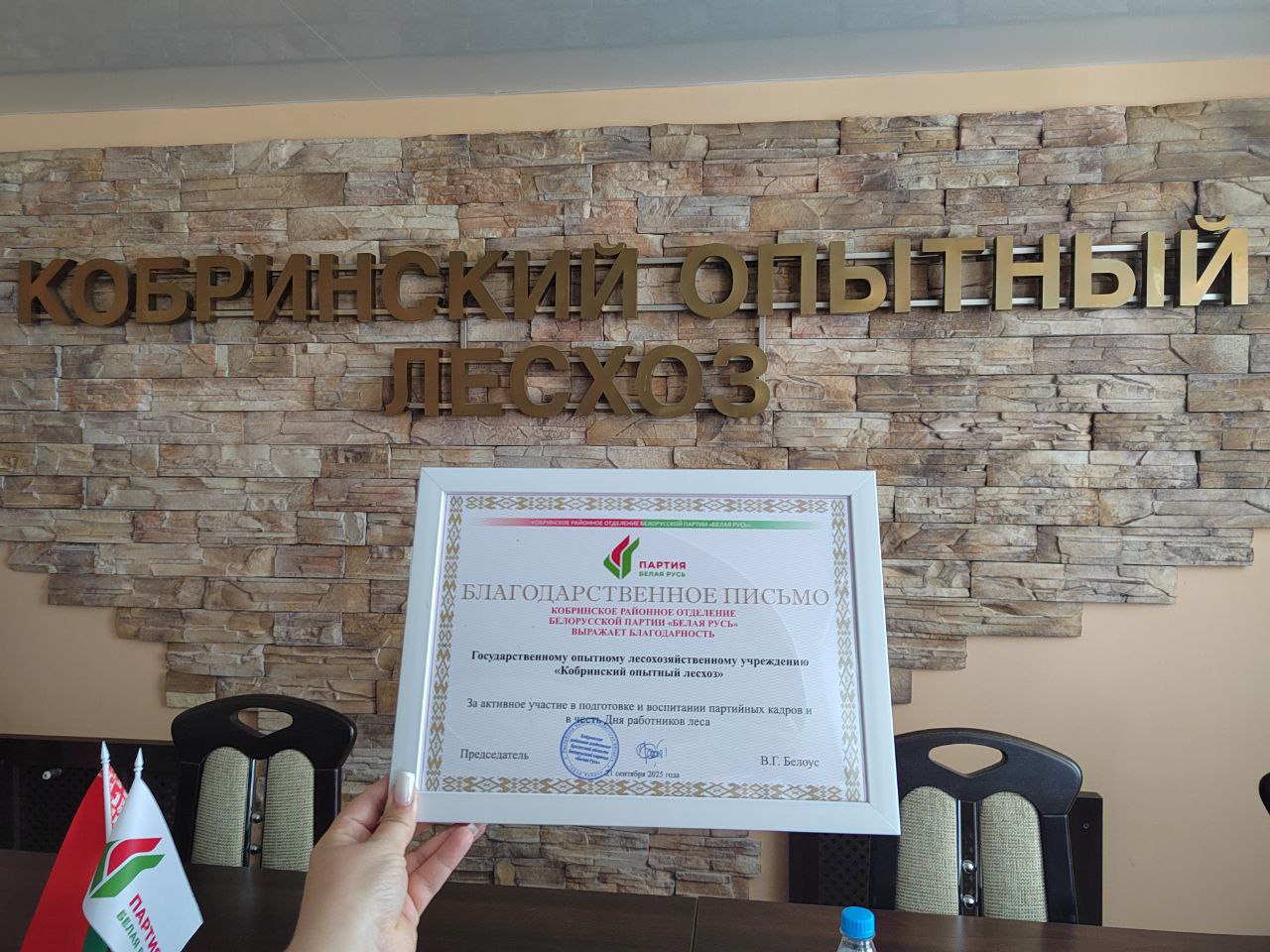В торжественной обстановке депутат Палаты представителей вручила директору Кобринского опытного лесхоза Николаю Полуянову благодарственное письмо Кобринского районного отделения Белорусской партии "Белая Русь", высоко оценив гражданско-патриотическую работу, которая ведётся в данном коллективе.
